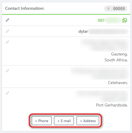 Once you are on the donor’s profile you can scroll down until you get to the contact information block and click the information button that you wish to add.