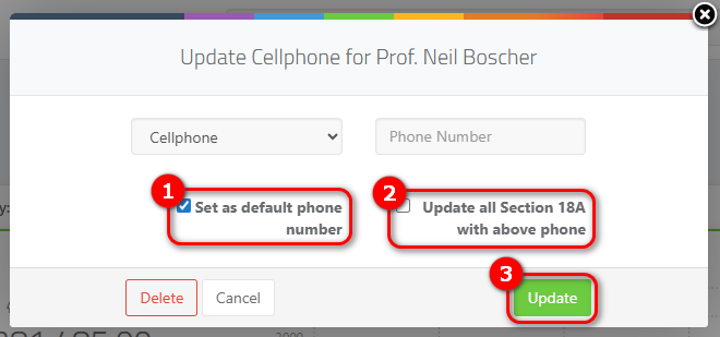 when adding an additional phone number you can choose to set it as the default number by ticking the box or you can choose to update the new phone number across all existing section 18As and then saving the changes.