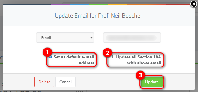 When adding an additional email address you can choose to set it as the default email by ticking the box or you can choose to update the new email across all existing section 18As and then saving the changes.