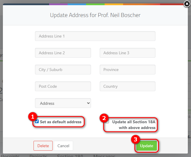 When adding an additional address you can choose to set it as the default address by ticking the box or you can choose to update the new address across all existing section 18As and then saving the changes.