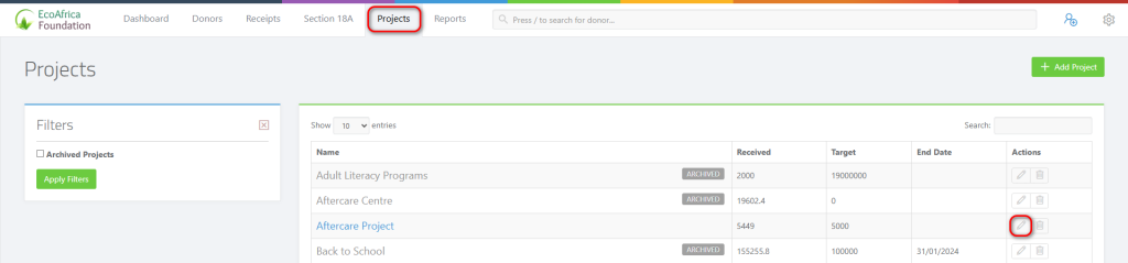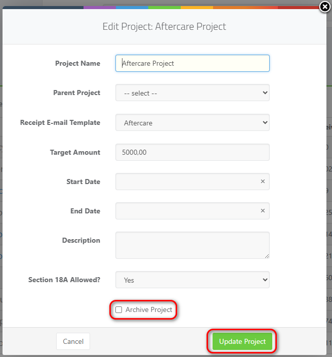 Once a project is completed, or if you are no longer fundraising for a specific cause, you may choose to Archive a project.