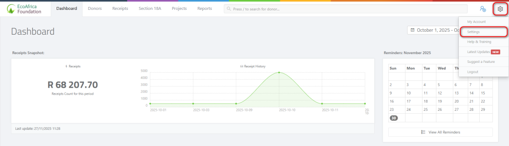 Click on the settings icon in the main menu bar. Go to settings in the drop down menu.