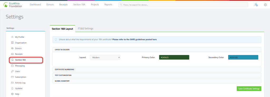Here you can select a certificate template, as well as a primary and secondary colour for your tax certificate.