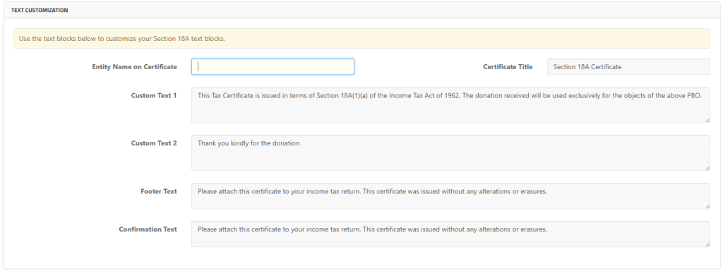Use the text blocks to edit the static text that appears on your tax certificate.