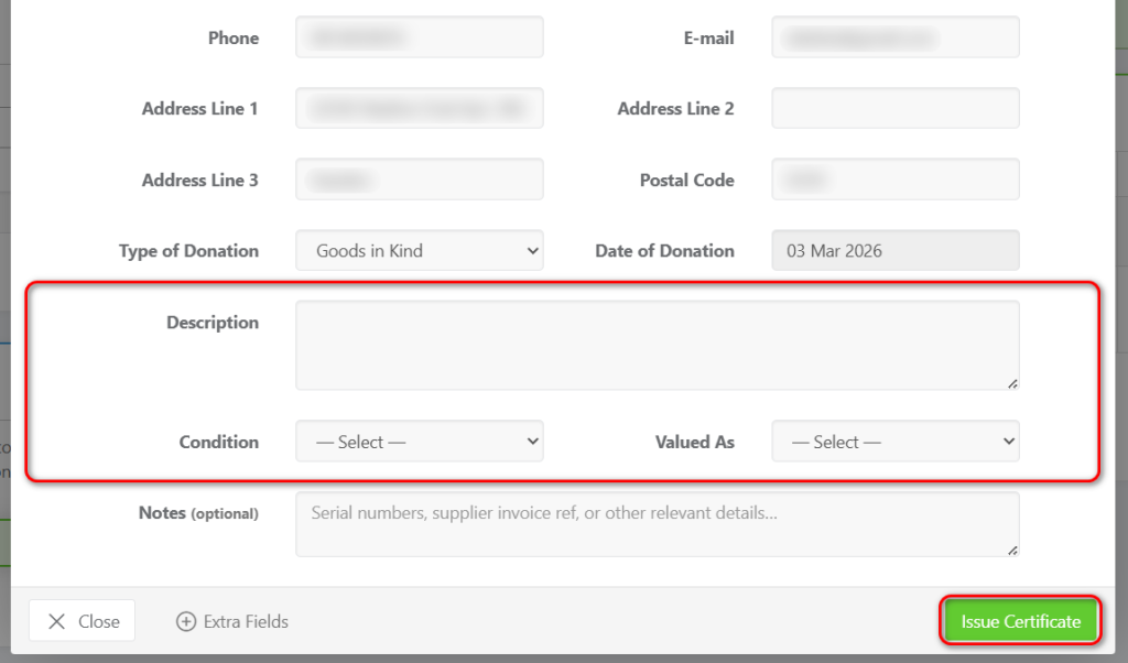 • Description – A clear description of the goods donated (e.g. School uniforms, books and supplies for Special Hearts Primary School). This is a required field and will appear on the certificate.
