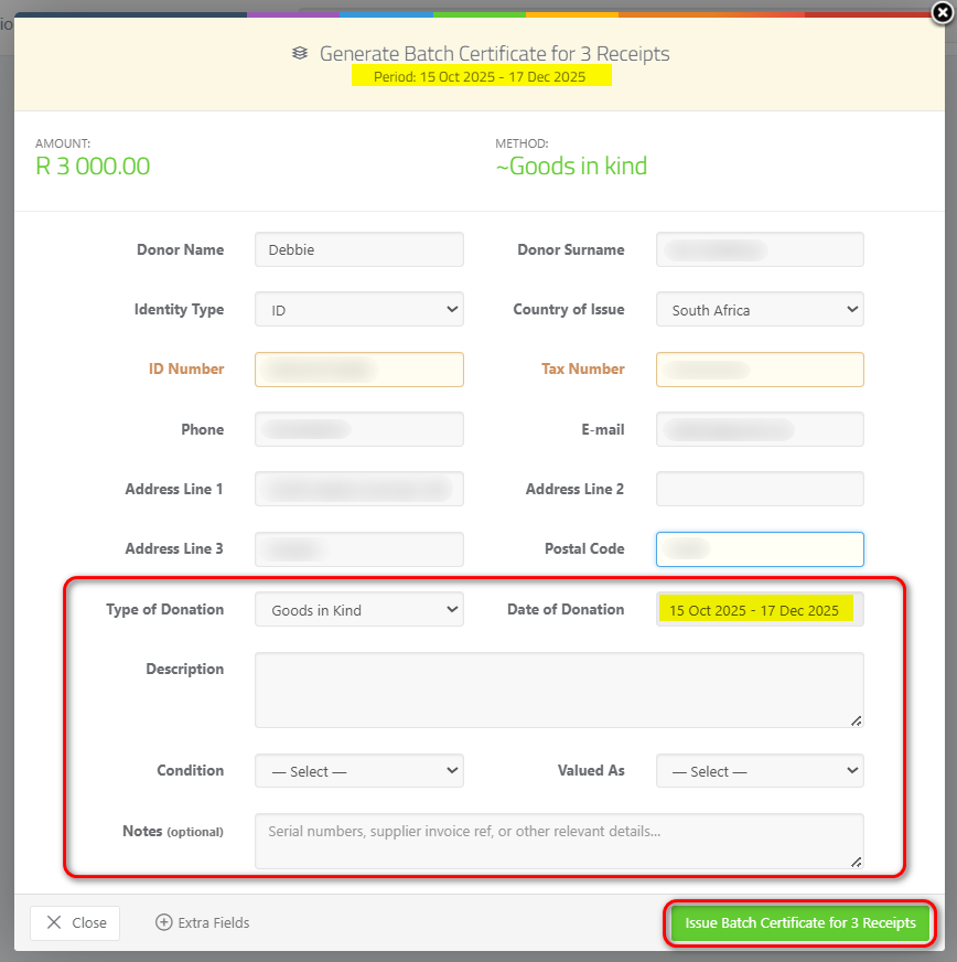 When Goods in Kind is selected as the Type of Donation, additional fields will appear to capture the required information for SARS compliance: