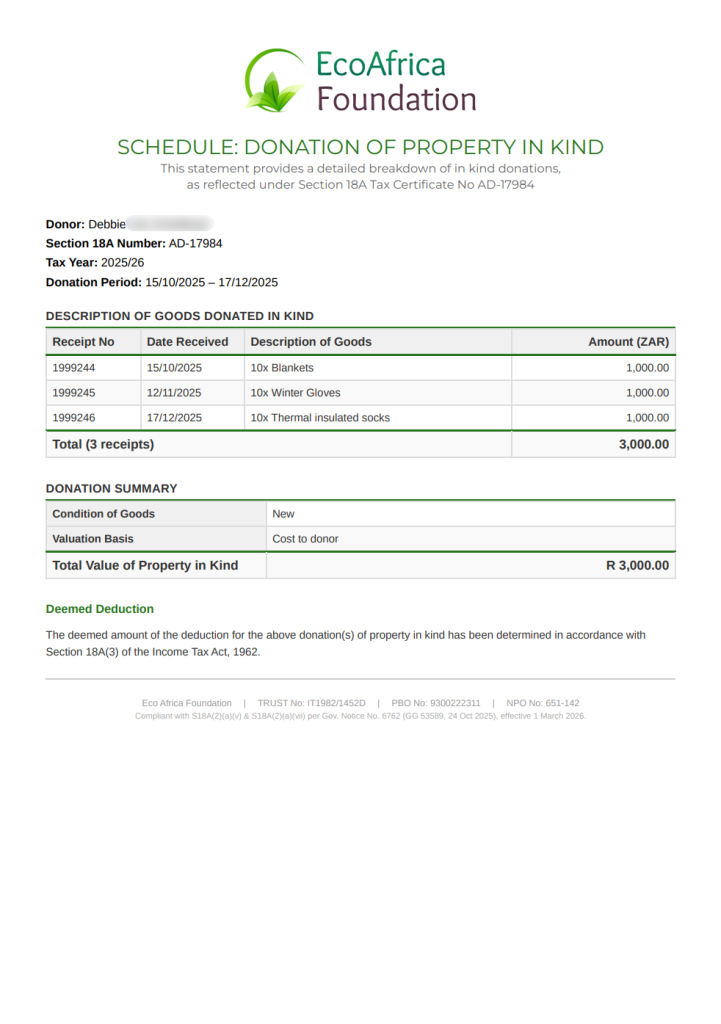 Some donors may request a Section 18A tax certificate, which allows them to claim a deduction on their taxable income for donations made to your organisation.
