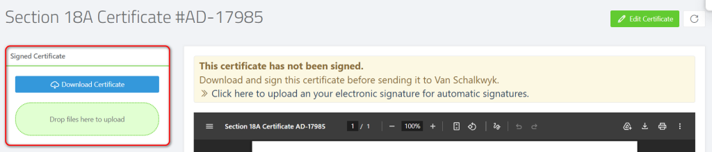 Manual signature: If you have not set up an automatic signature, download the certificate, print it, have it signed, then scan and upload it back into ActiveDonor using the Drop files here to upload area on the certificate page.