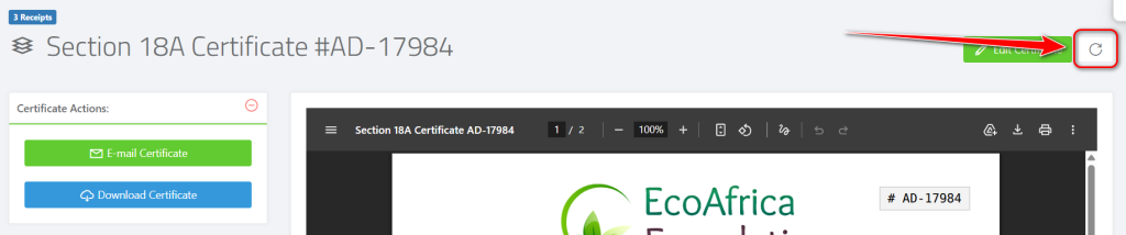 If you have previously issued a certificate that does not reflect your latest settings – such as an updated logo, NPO number, or PBO number – you can refresh it using the Regenerate button in the top right corner of the certificate page. This will rebuild the certificate using your current settings without changing any of the donation details.